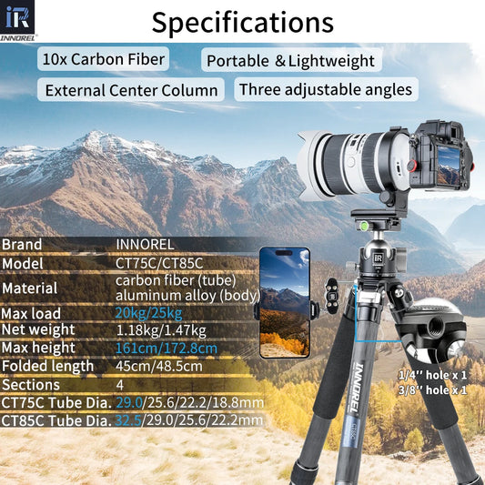 INNOREL CT75C/85C Carbon Fiber Tripod for DSLR Camera Heavy Duty Stand Low Gravity Center Ballhead with Adjustable Center Column