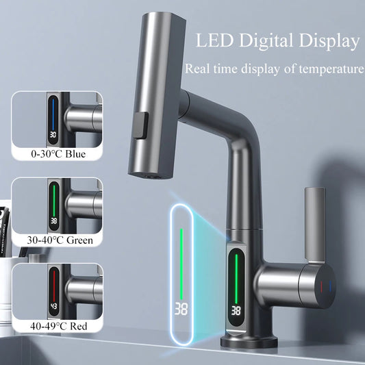 Smart Digital Display Basin Faucet 3 Function Pull Out Waterfall Spout Deck Mount Cold Hot Water Mixer Liftable Sink Crane Tap