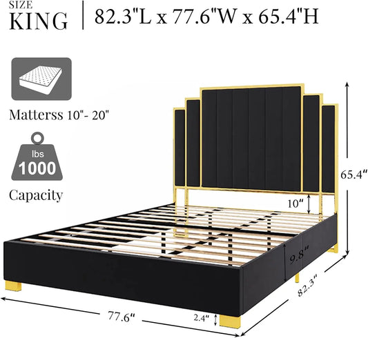 King Size Platform Bed Frame, 65" Velvet Upholstered Bed with Gold Trim Headboard/Wooden Slats/No Box Spring Needed/Black