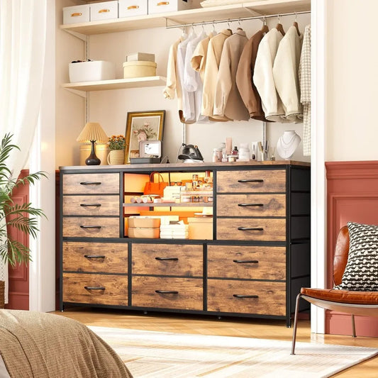 Dresser with LED Lights & Power Outlets, 12 Drawers Dresser TV Stand for 60''TV for Bedroom Dresser Fabric Dressers & Chest