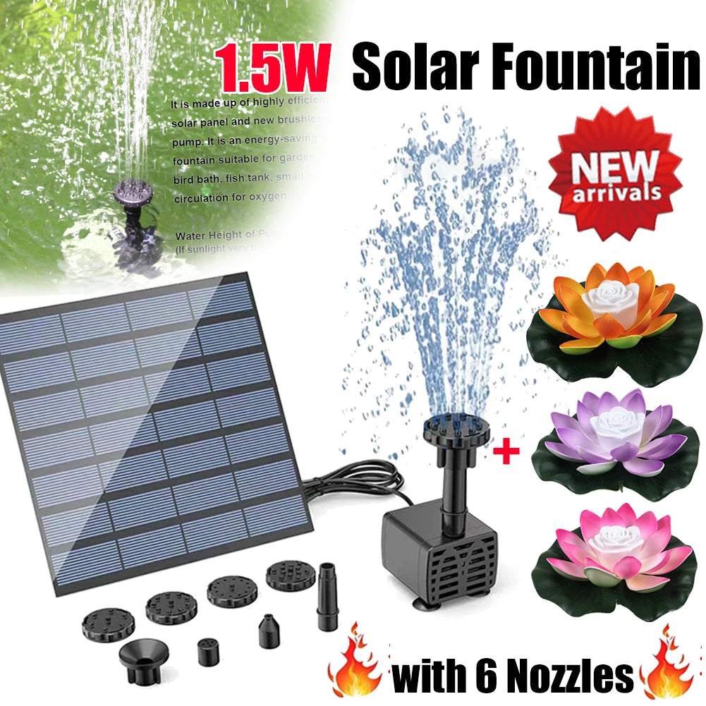 1.5W Solar Fountain Pump with 6 Nozzles Mini Fountain Pool Pond Waterfall for Outdoor Bird Bath Pond Garden Decor Floating Lotus