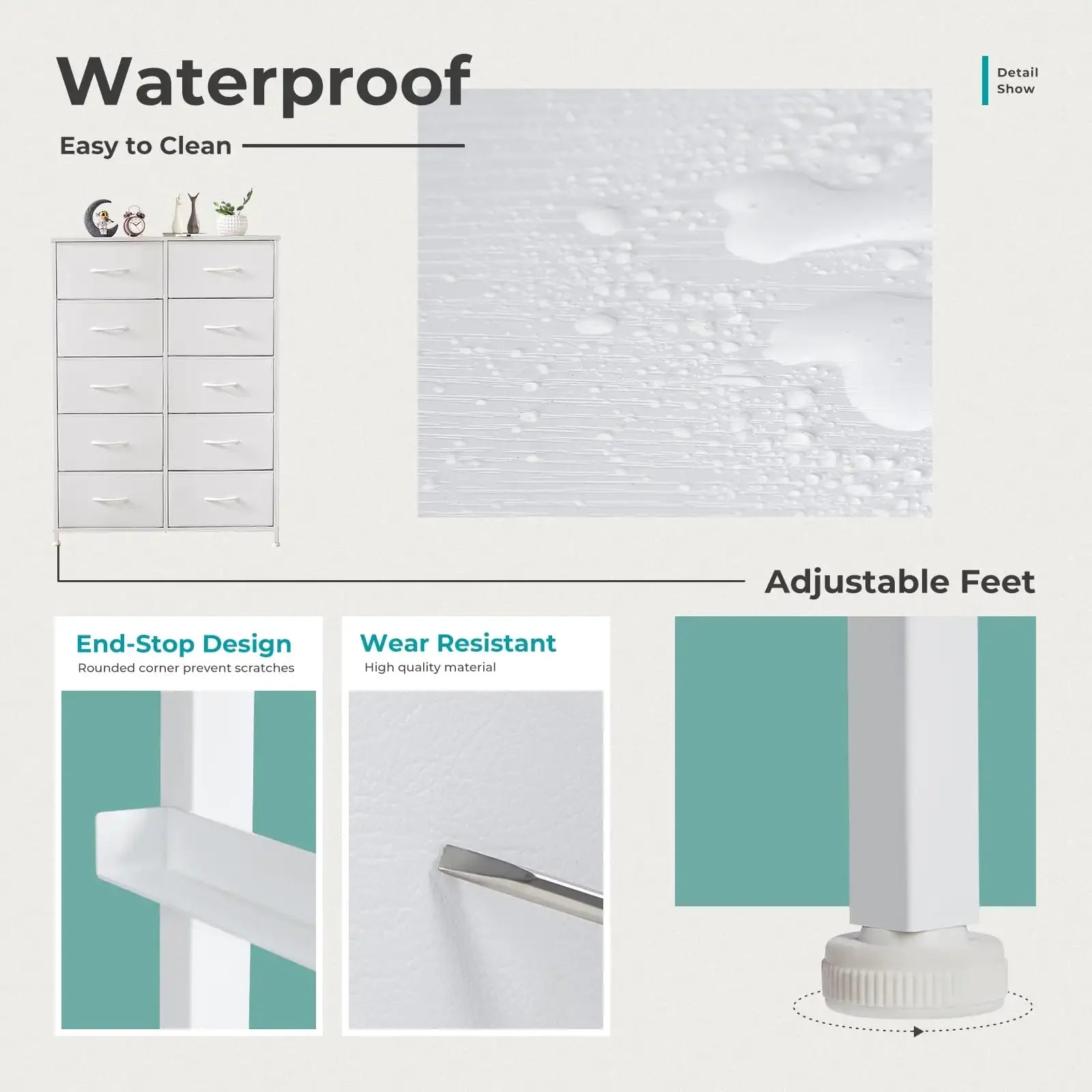 10 Drawer Dresser for Bedroom, Tall Chest Organizer with Fabric Bins, Steel Frame, White