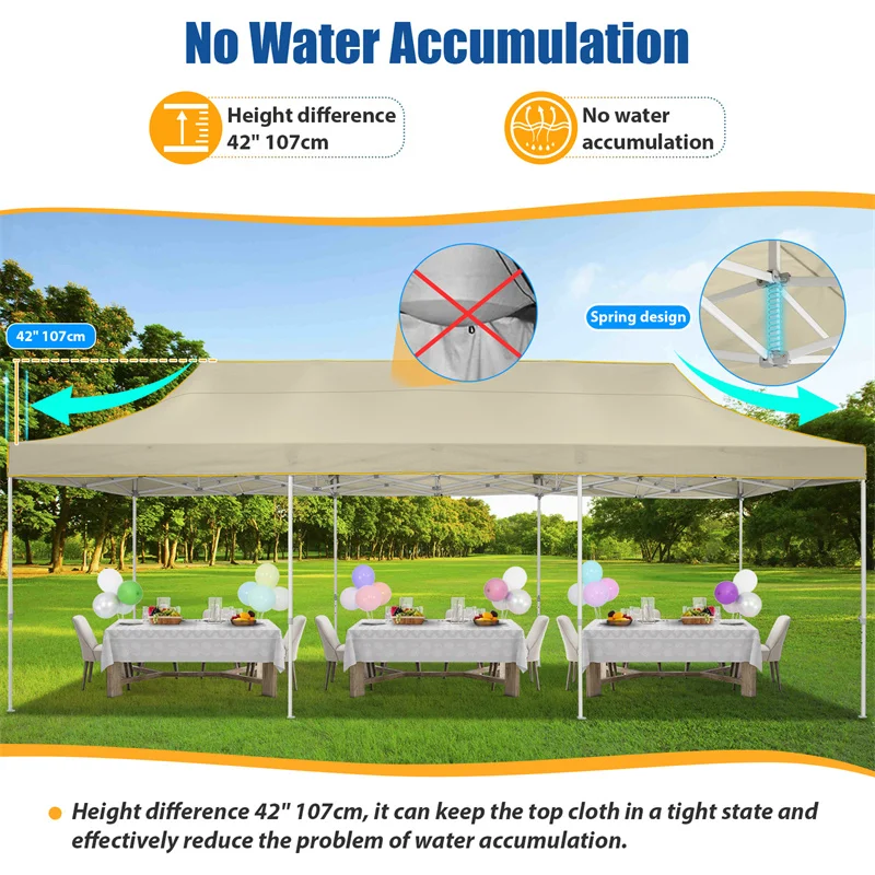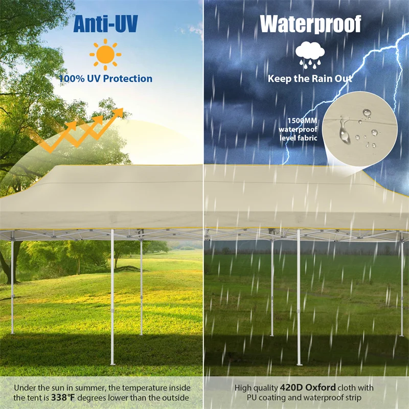 [- & -] Super durable pop up canopy top made with 420D Oxford fabric with PVC coating and waterproof strip to ensure 99% UV protection, 1500MM water resistance, and cooler shade area. Under the work of the height difference 42", it can keep the top cloth in a tight state and effectively reduce the problem of water accumulation.
