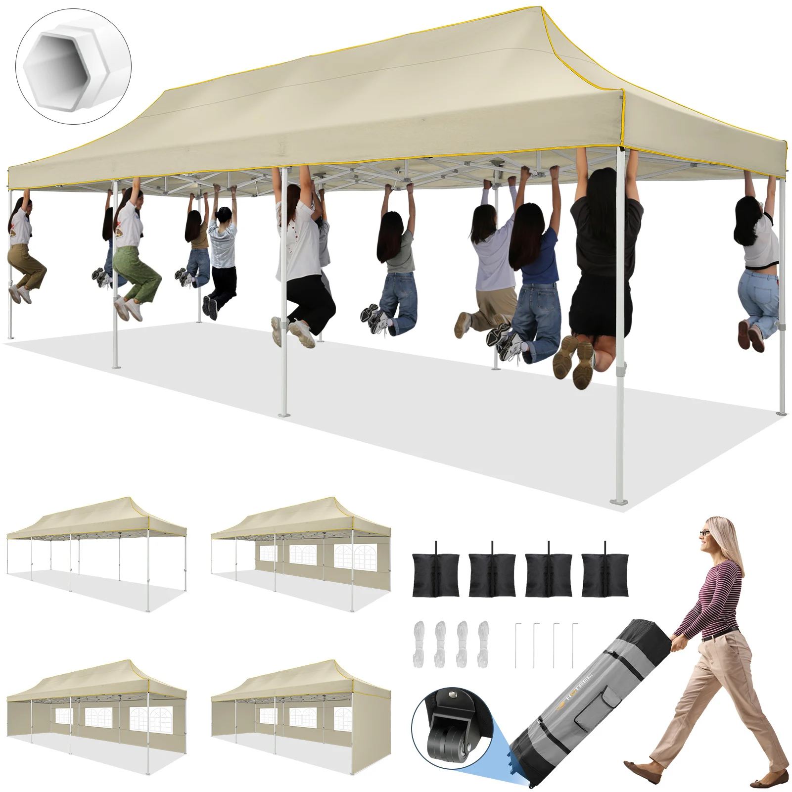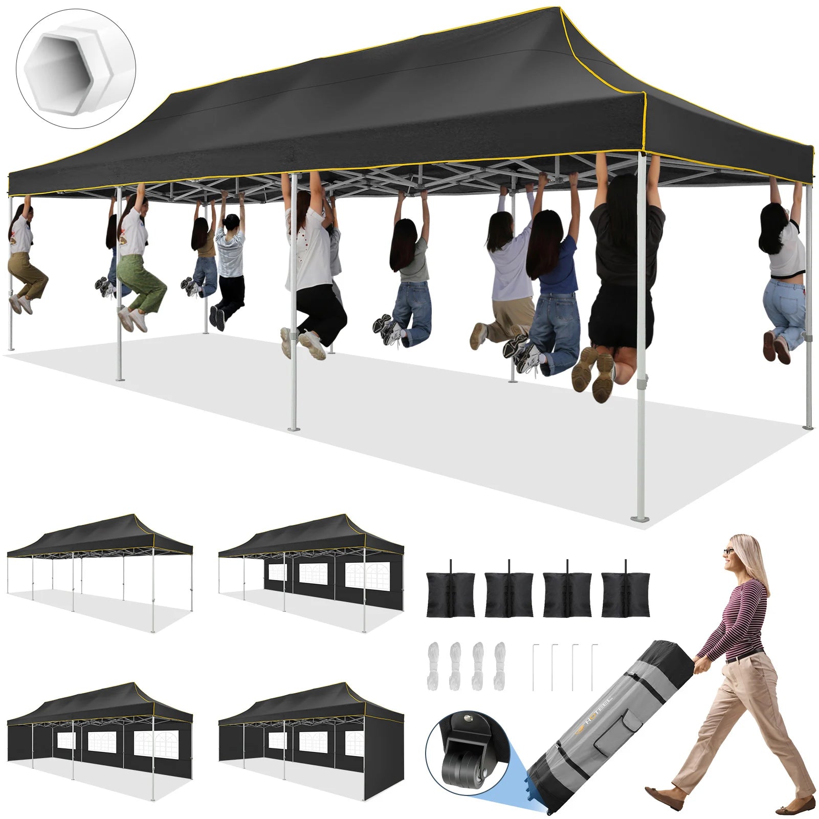 [ & ] HOTEEL 10x30 canopy with sidewalls is easy to set up and close , no additional tool required, 3-4 people can assemble it. And this tents for parties equipped with a 600D Oxford fabric portable roller bag, make sure you can take the outdoor canopy any where and stow in your car trunk easily.