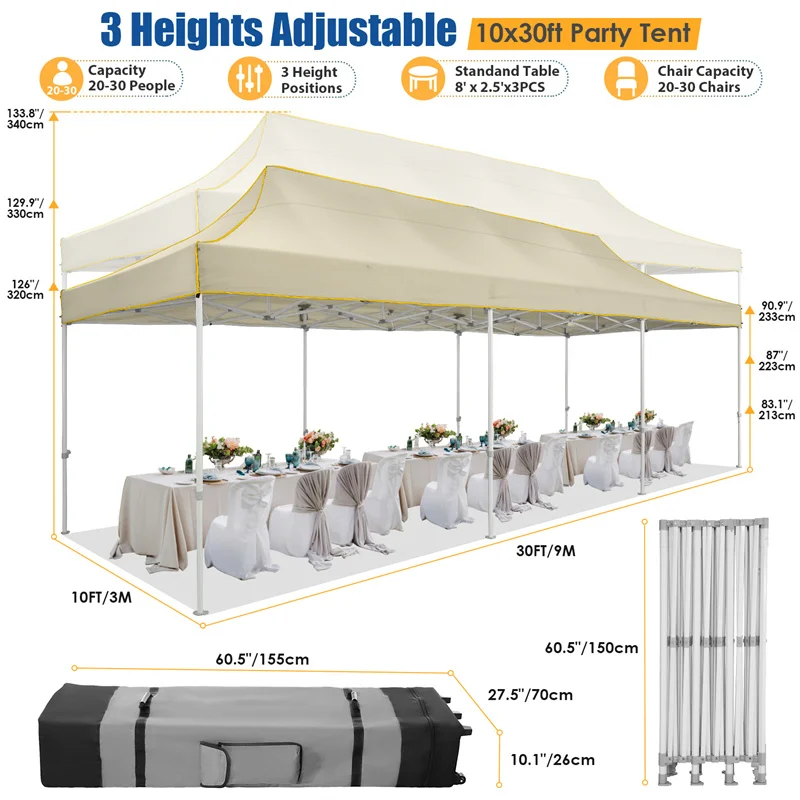 [ & ] HOTEEL 10x30 pop up canopy provides 600 sqft spacious covered space and 3 adjustable heights for your choice, it can easily accommodate 25-30 people, meet your different needs for holding large gatherings. Perfect for wedding, birthday party, commercial activities and other larger events, also this canopy 10x30 can use as a carport.