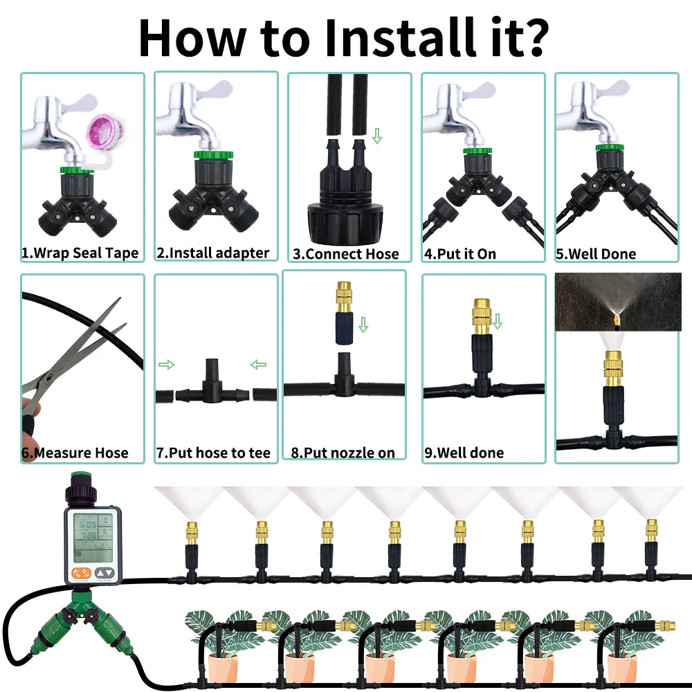 15M-30M Outdoor Misting Cooling System Garden Irrigation Watering 1/4'' Brass Atomizer Nozzles 4/7mm Hose for Patio Greenhouse
