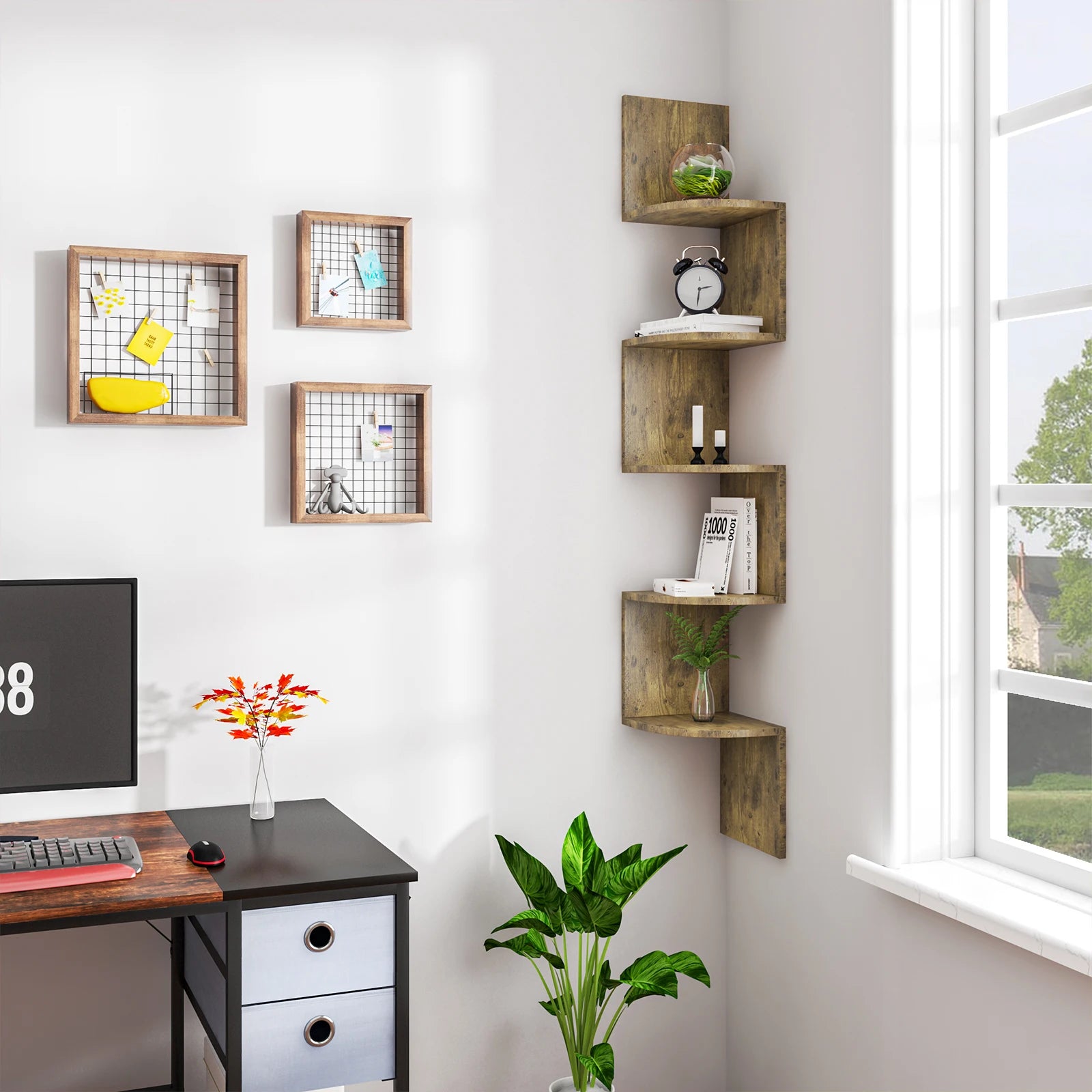 Wooden 5 Tier Floating Hanging ZigZag Style Corner Wall Shelf