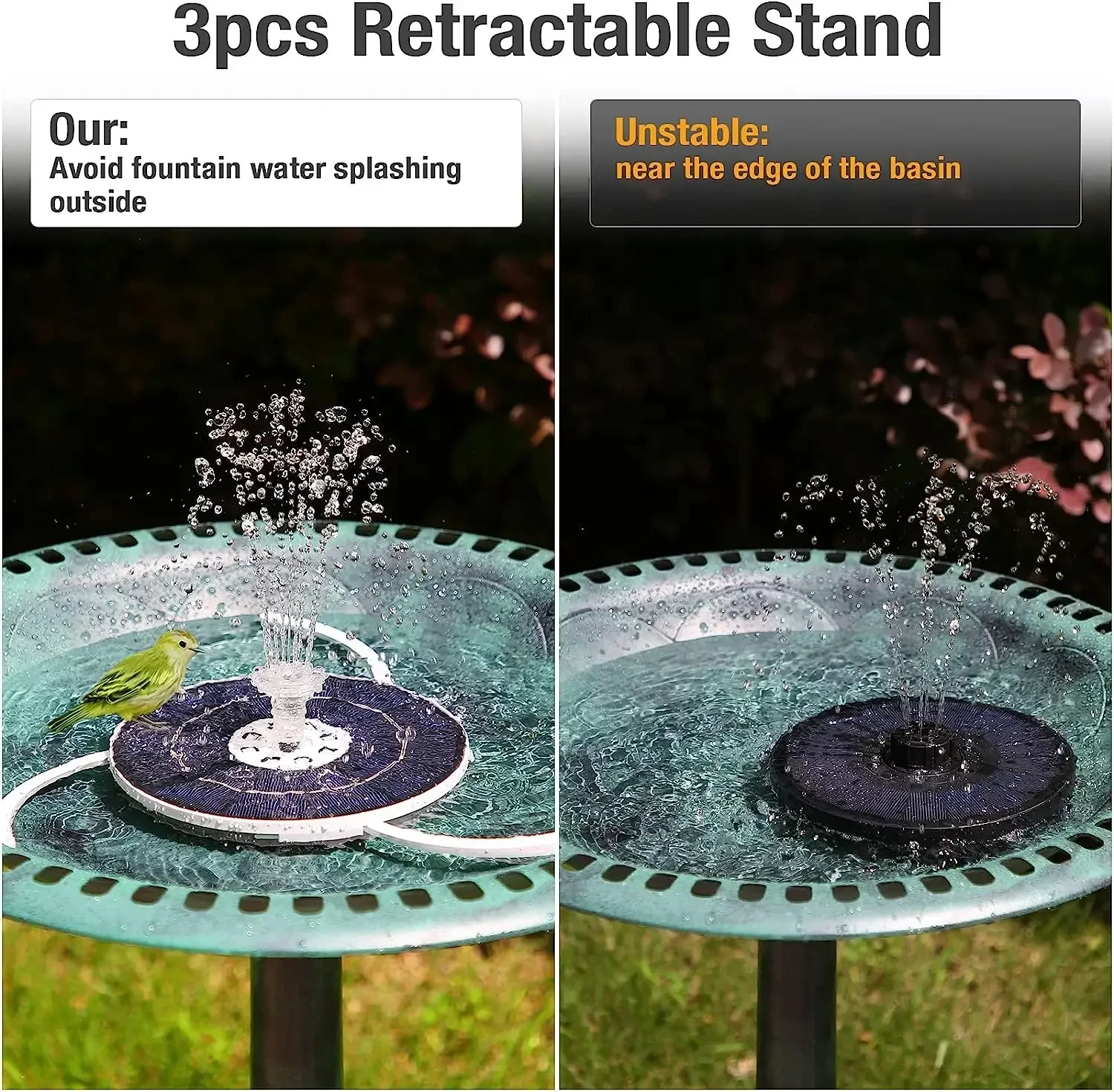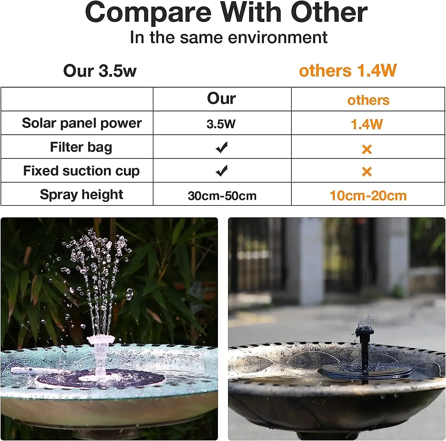 Efficient solar fountain: With a power of 3.5 watts, it can work quickly. In the sun, the height of spray can reach 100 cm. Stable performance, our company's exclusive fixture can avoid random movement of solar fountains. It can prevent the fountain from spraying water outside the bathtub and quickly empty the water. No need to waste time and water anymore.