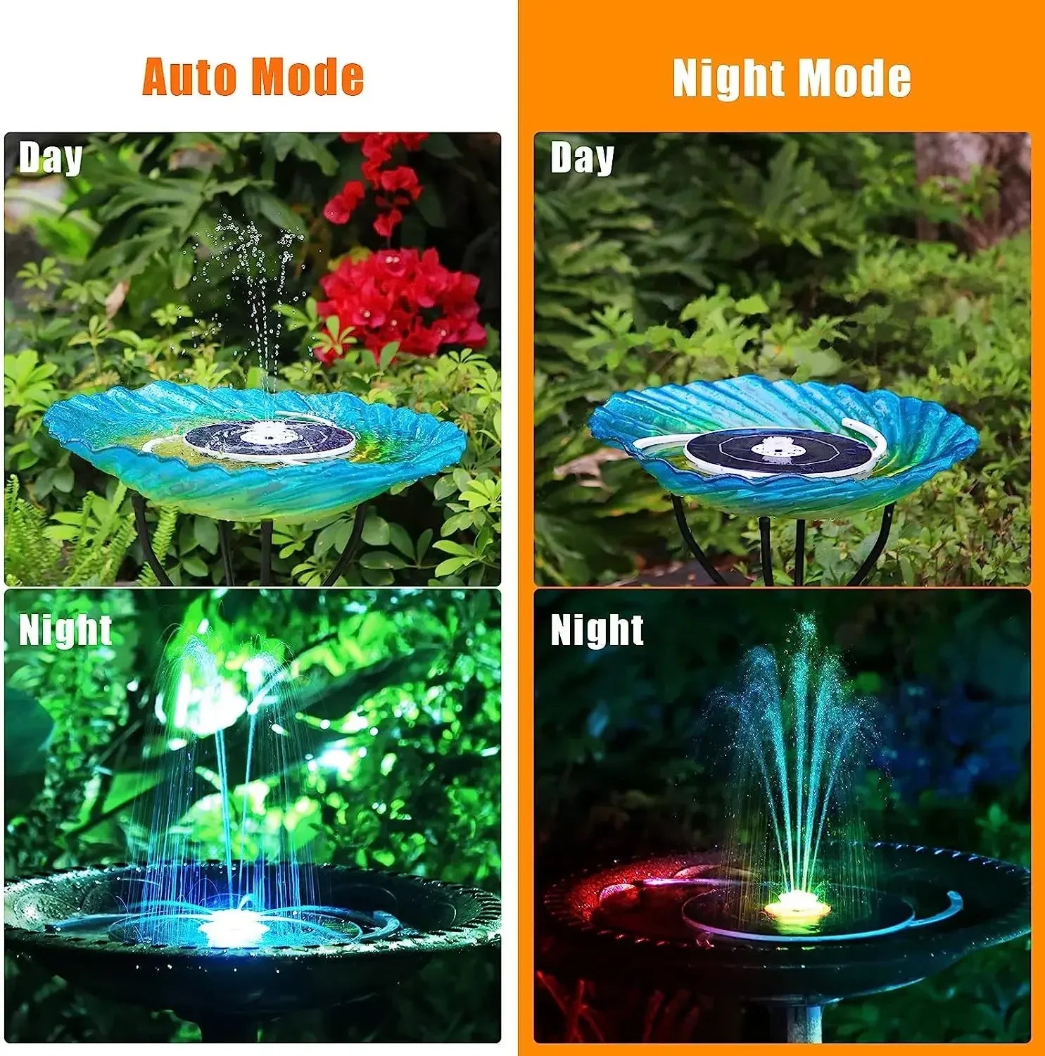 At night, the LED lights will be showing in automatic cycle while the solar fountain is working.