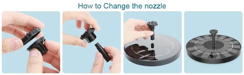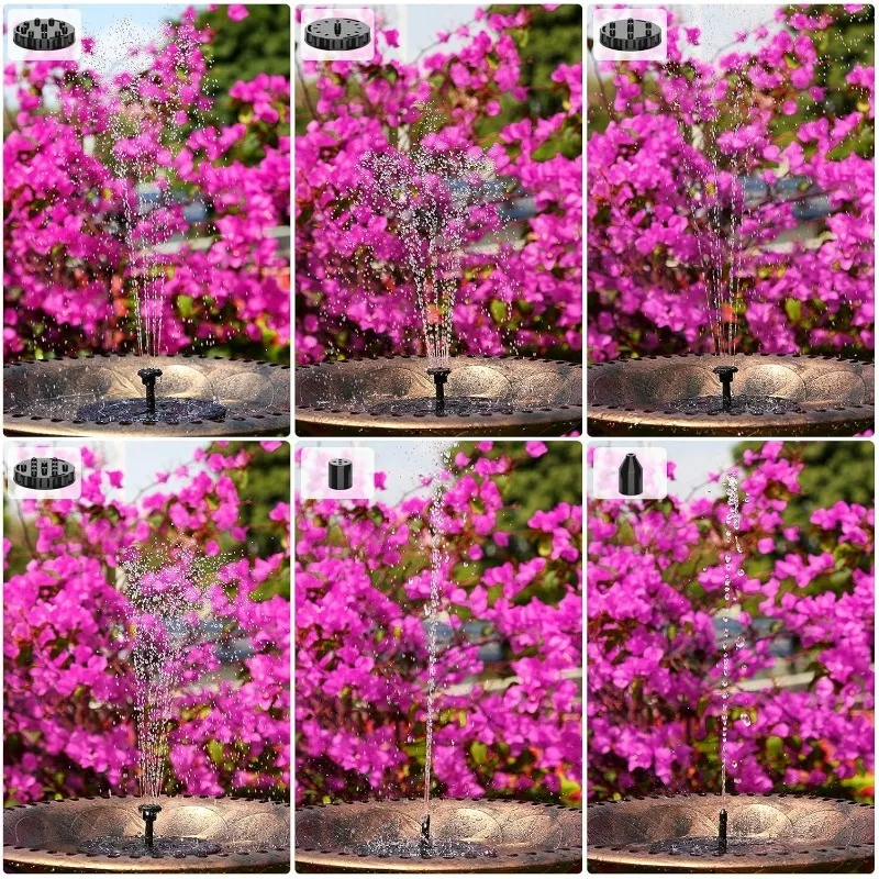 [Six spray patterns]: Solar water fountain contains 6 different nozzles, which will produce different spray shapes and spray patterns. The height can be adjusted by replacing the nozzles to avoid splashing out of the basin. The spray height can reach 15-27 inch. You can easily replace the nozzle.