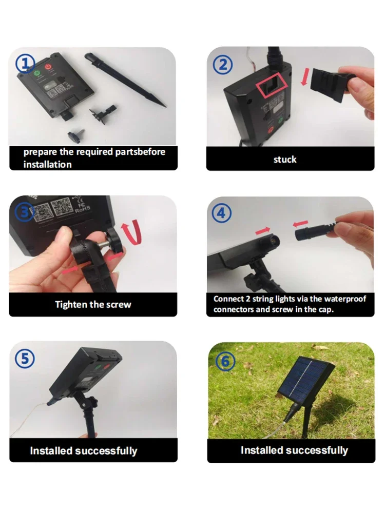 1.Solar Powered - If the light you receive is not lit, don't worry, it should be fully charged under the sunlight for two days before first using.