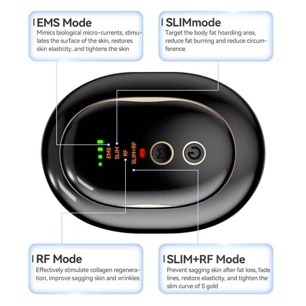 Based on your needs and skin condition, press the mode button to select the desired treatment mode—(EMS, SLIM, RF, SLIM+RF). After massaging, long press the power button for 2 seconds to turn off. Wipe clean and store properly.