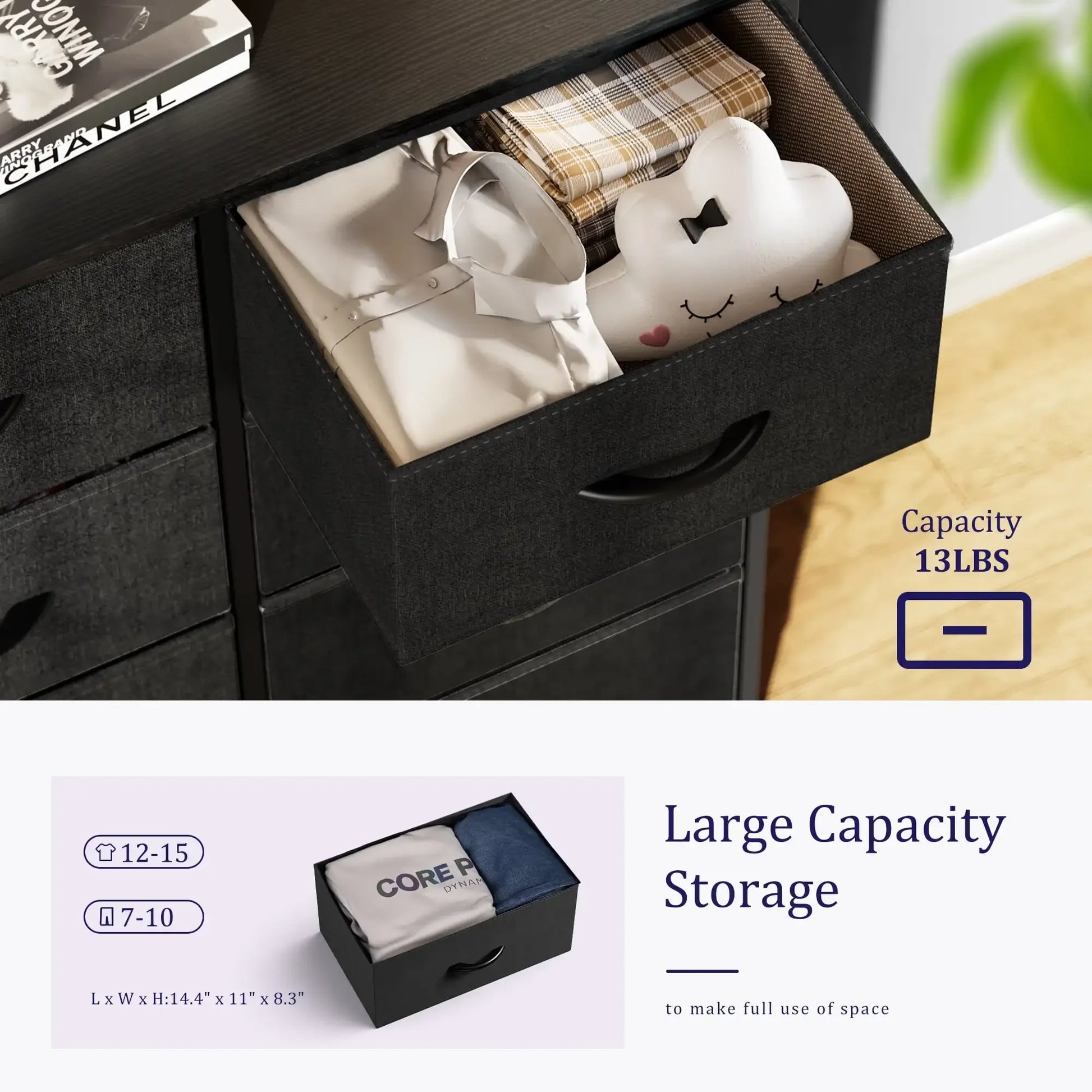 - Constructed with a high-quality steel frame and premium non-woven fabric, this storage dresser ensures a long lifespan. The thick wood board provides excellent support for your daily necessities, while the metal foot guarantees stability.