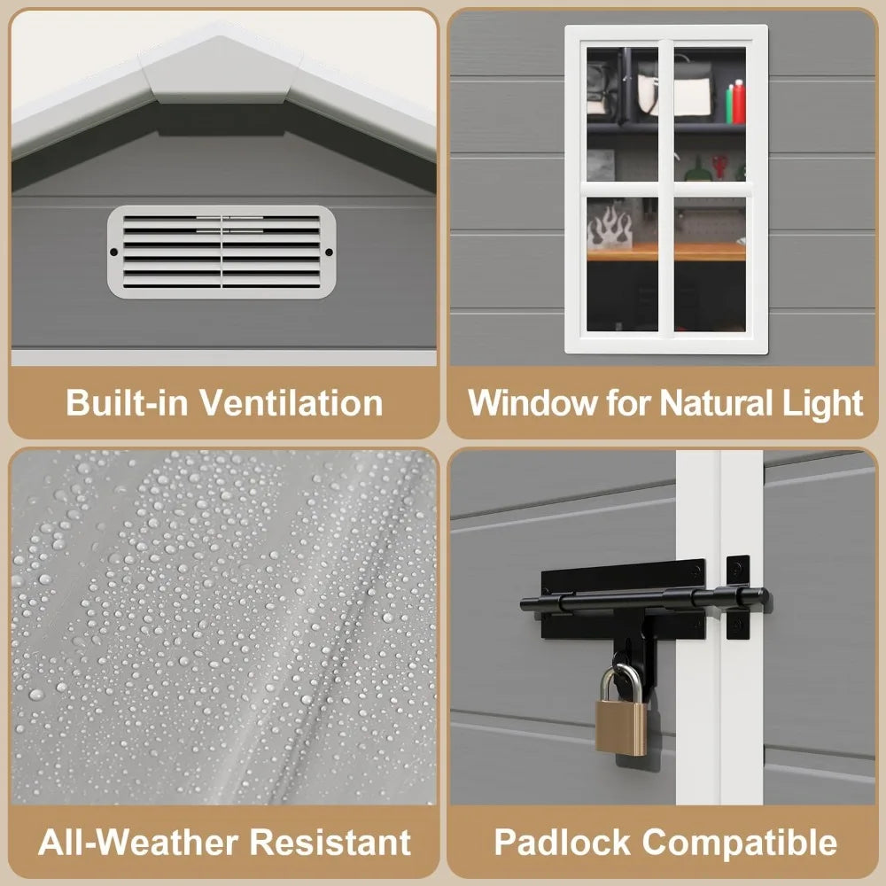 - Waterproof & Ventilated Design: Featuring a sloped roof to prevent water buildup and strategically placed windows for ventilation and natural light, this resin shed keeps your tools and equipment dry and fresh—no matter the weather. Say goodbye to moisture damage and hello to long-lasting storage