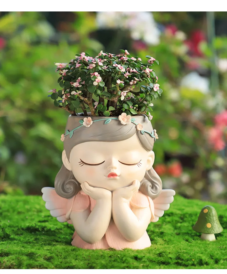 7 inch Cute Angel Girl Face Planter Pot with Drainage Hole, Resin Fairy Tale Planter Ornamental Statues for Home Office Decor