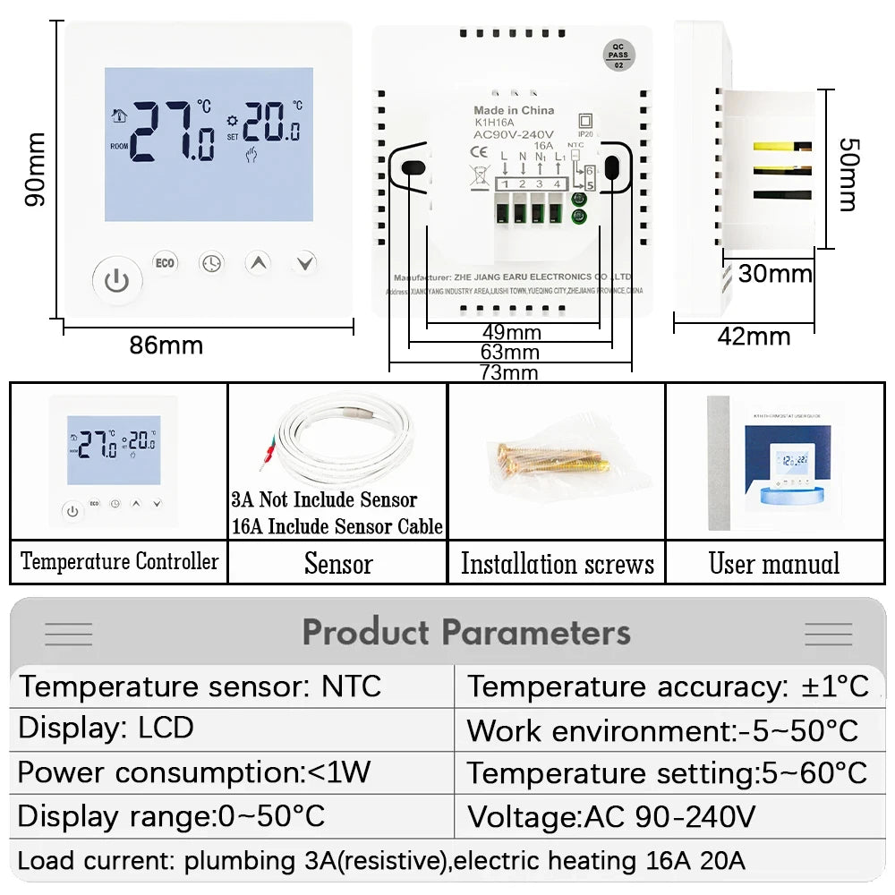 AC90V-240V 3A 16A Water Electric Floor Heating TRV House Room Thermostat Temperature Controller Digital LCD Display Wall Mounted