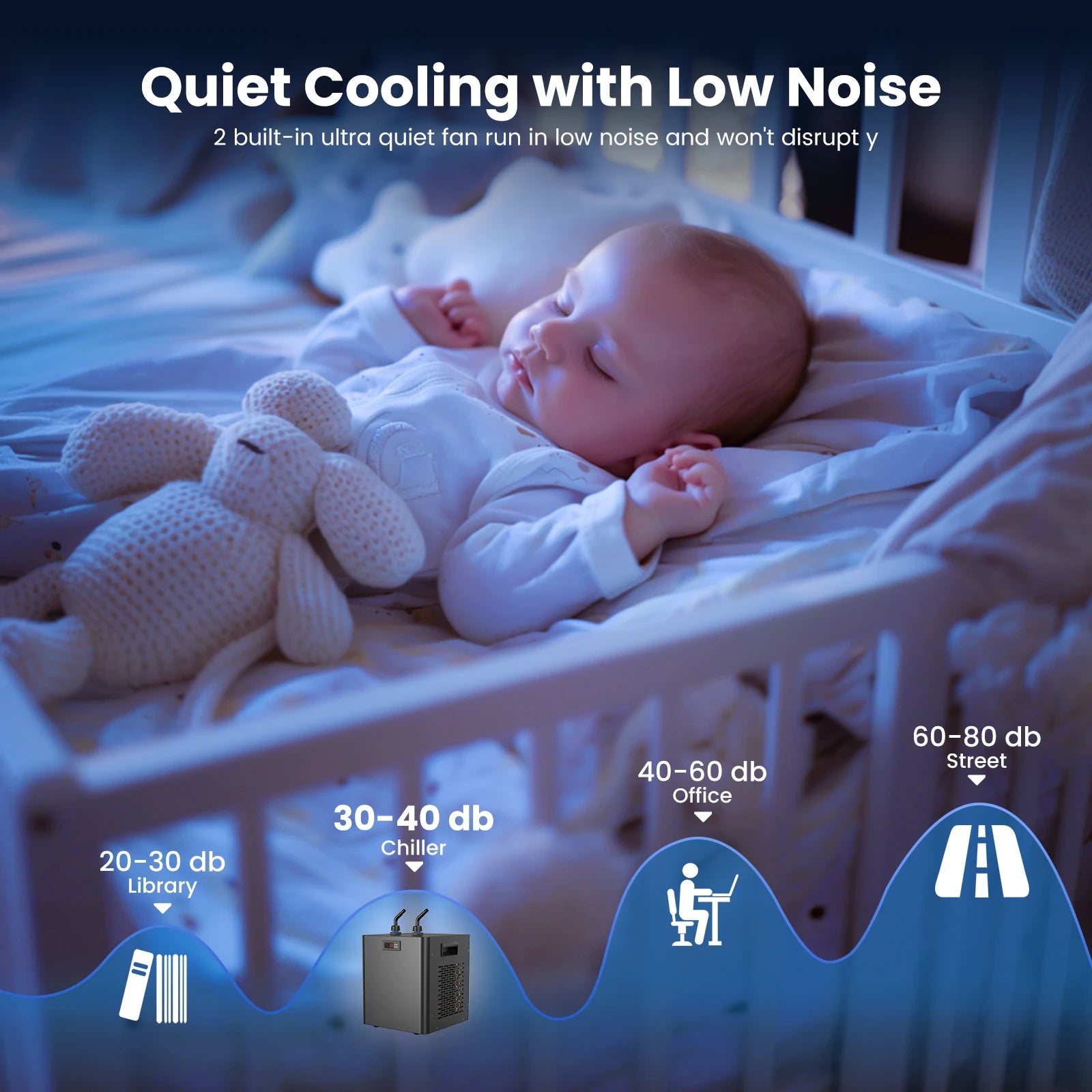 【Silent operation】- The special noise-reduction design makes the compressor run very quietly, the low-noise operation will not affect your daily work and rest. And monitors the water temperature in real-time, when the water temperature is higher than the starting temperature, the chiller automatically runs to cool down. After power off and restarting, the chiller will continue to cool according to the original set temperature.