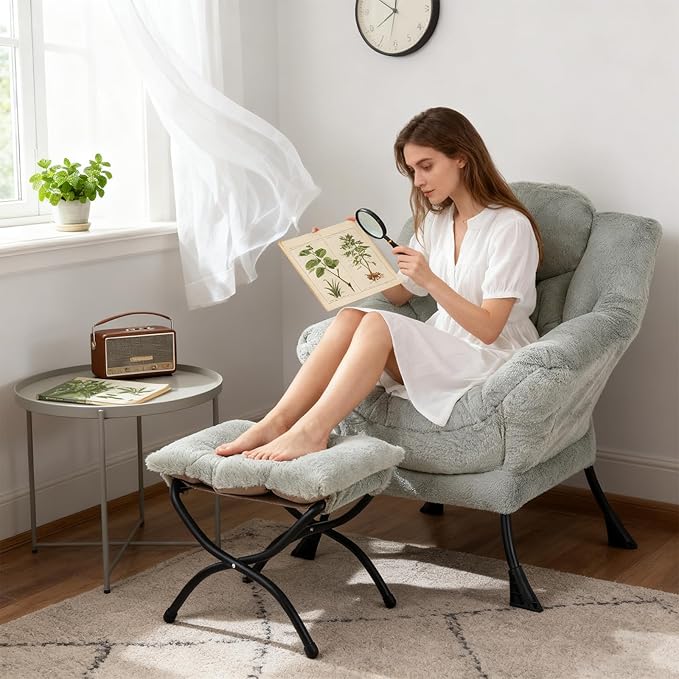 - LAZY CHAIR WITH OTTOMAN: The lounge chair is equipped with a footstool on which you can rest and enjoy the extremely comfortable seating experience. And, you can also place the stool next to the sofa and end table in the living room as a foot pedal to relax your feet, or you can place it in the hallway or doorway and sit on a small stool while you change your shoes. What's more, the footstool can be quickly folded up for easy storage when not in use.