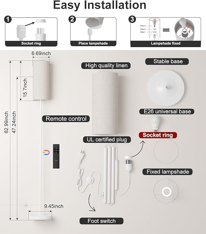 - Stable Base&Linen LampShade: The newly upgraded tall lamps for living room has a metal base that is heavy enough to keep it firmly placed. The lampshade is made of linen material, which effectively blocks some of the light emitted from the bulb, making the light comfortable and soft.