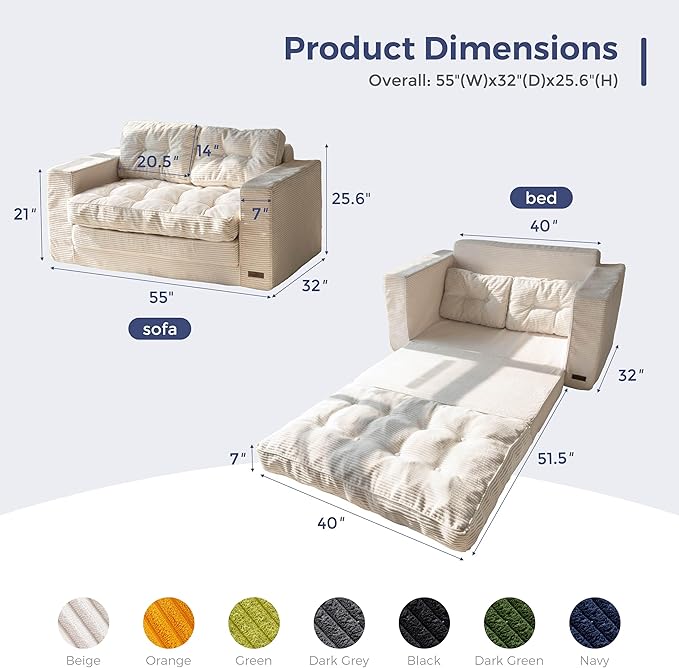 - Generous Dimensions: With a sofa size of 32"L x 55.5"W x 21"H and a spacious sleeper size of 83.5"L x 40"W x 7"H, Using high-density support foam filling, it can provide excellent support and comfort in both forms,making it an ideal choice for both lounging and sleeping