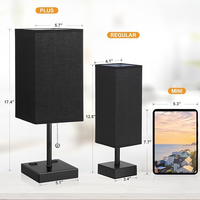 Black Medium Table Lamp with USB Ports - 3 Color Temperature Bedside Lamp for Bedroom, Pull Chain Control, USB A and C Ports, 2 AC Outlets, Bulb Included