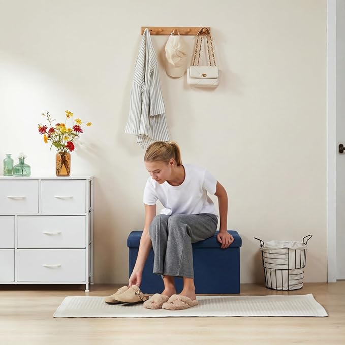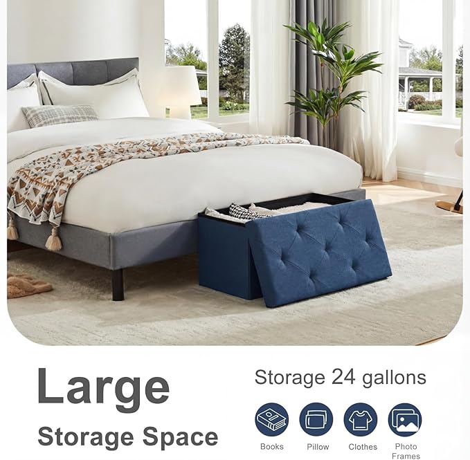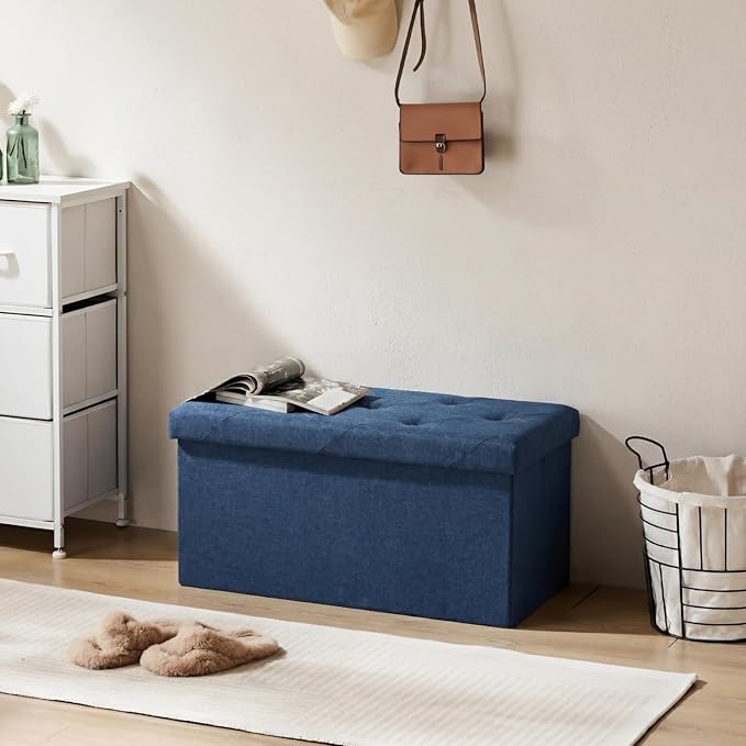 DUMOS 30in Foldable Storage Ottoman Bench, Ottoman Bench Foot Rest Stool with Padded Seat, Bedroom Bench with for Living Room, Support 660lbs, Blue
