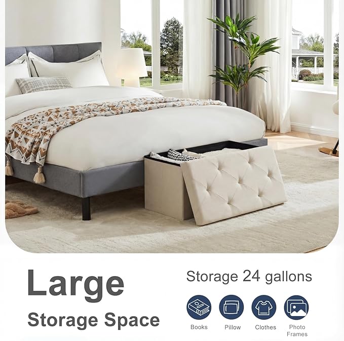 DUMOS 30in Foldable Storage Ottoman Bench, Foot Rest Stool Load 350Lbs,Storage Chest with Padded Seat, End of Bed Bedroom Bench for Living Room,Bedroom, Beige