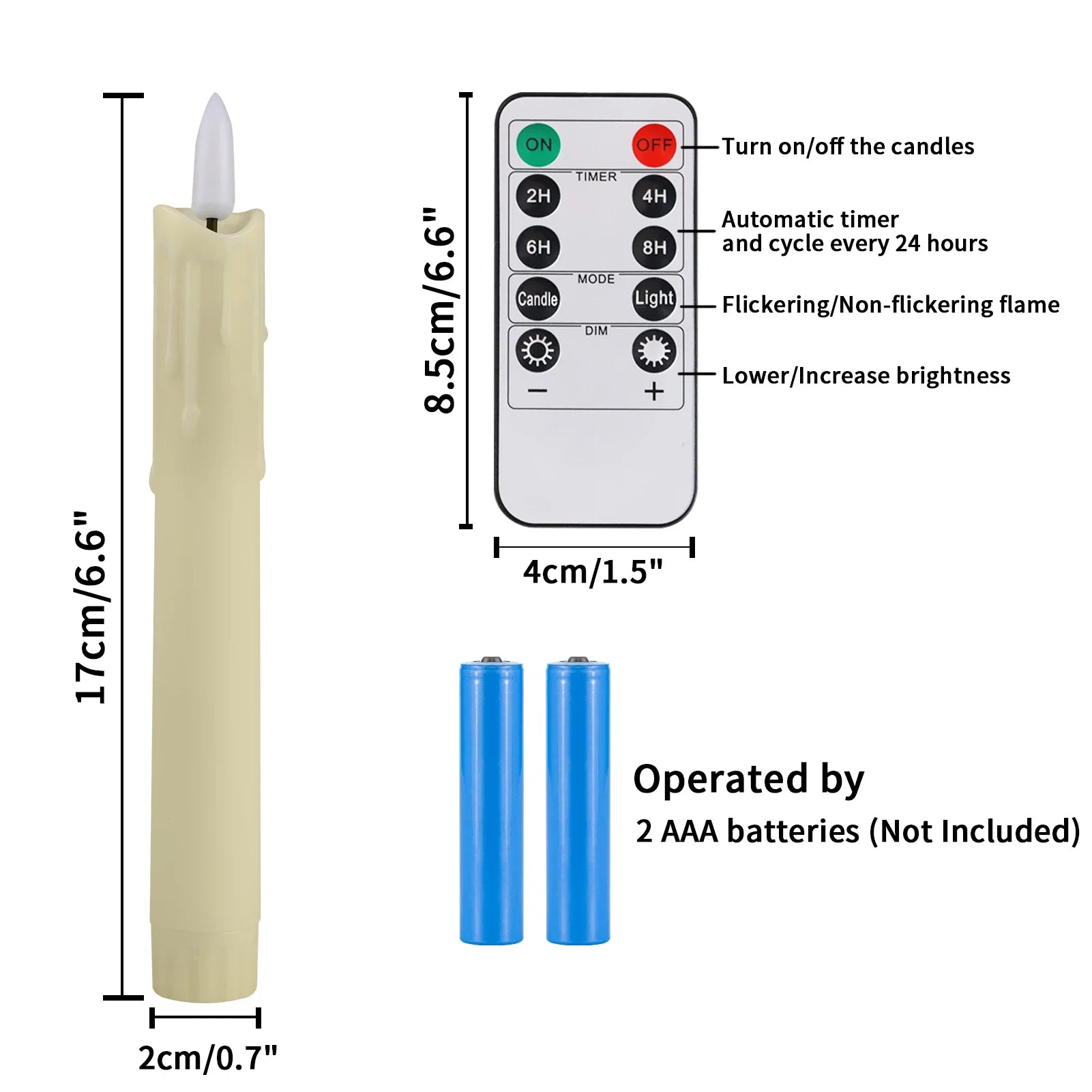 Package and Service: Each package contains 6*candles with Bottom and 1*10-keys remotes. Each battery power taper candle is thoroughly and rigorously tested before sale, Avoid using in high-temperature environment. If any problems during use, please contact our Customer Support Team and the problem will be resolved as soon as possible.