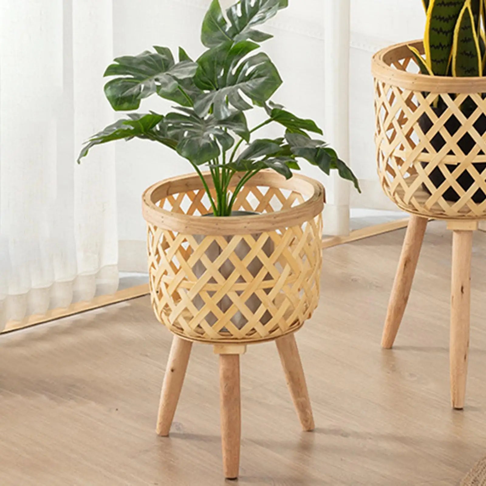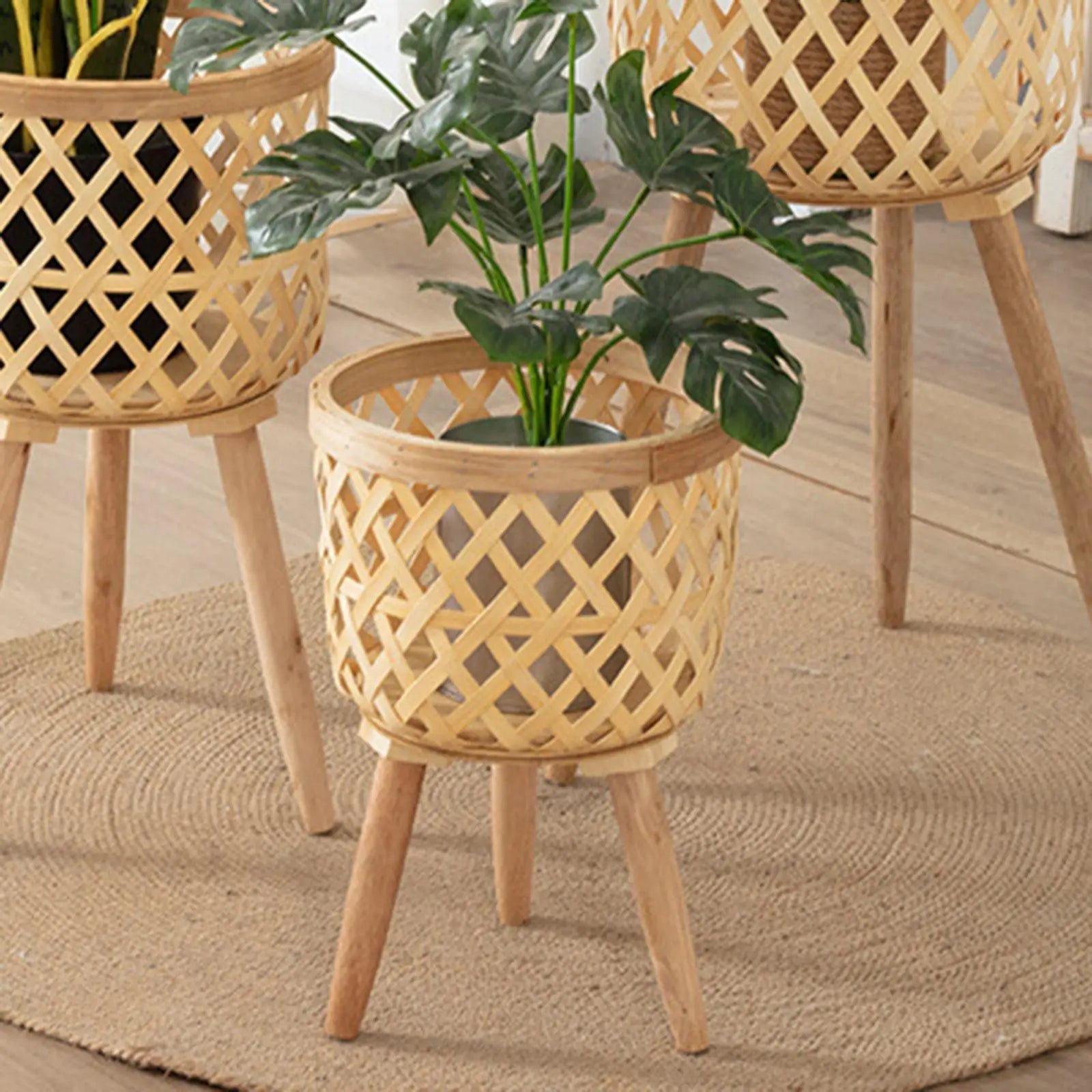 Hand Woven Flower Pot Tripod Stand Detachable Rattan Pot Wood Pastoral Flower Baskets for Balcony Planters Home Indoor Decor