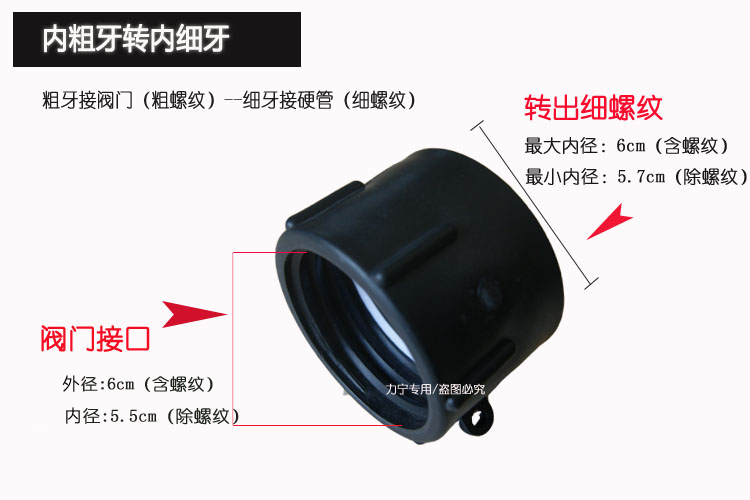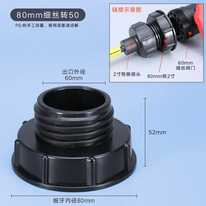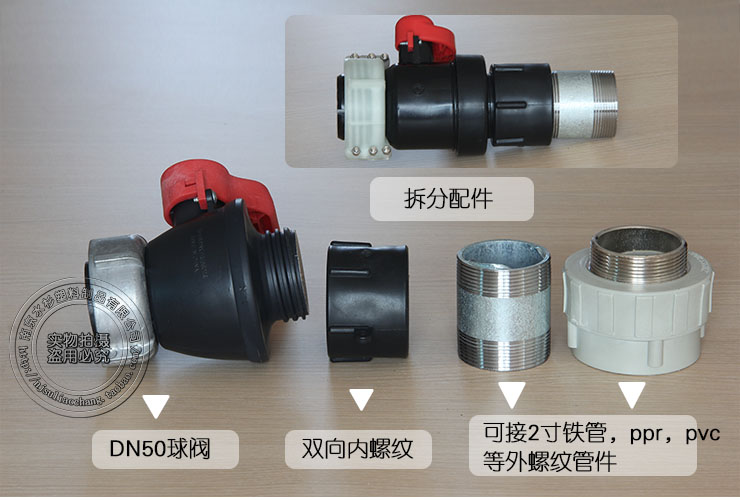 1. IBC ton bucket valve special fittings, thick thread can be connected to DN40, DN50, fine thread can be connected to PVC, PPR and other external thread fittings.