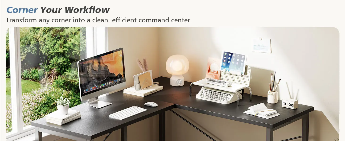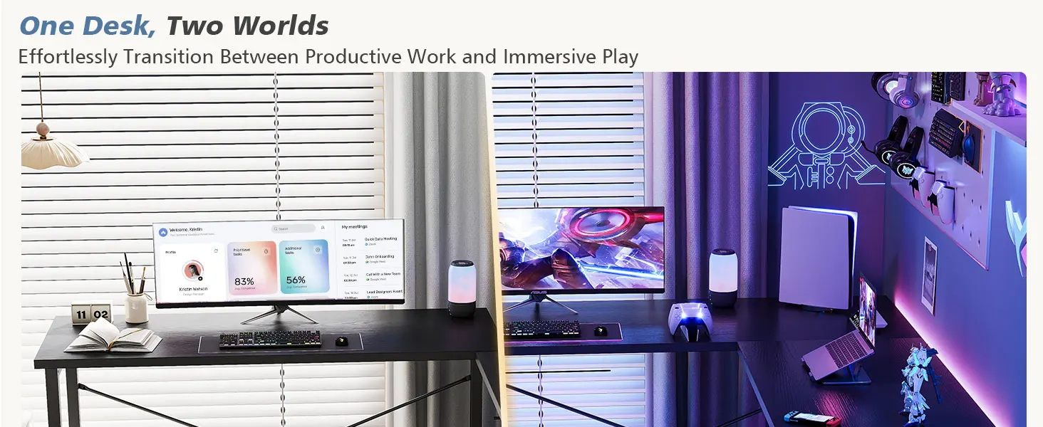 Rock-Solid & Spill-Proof: No more wobbles or worries. Built with a reinforced metal frame and X-brace, this l shaped computer desk offers unshakable stability. The waterproof tabletop resists damage from spills, ensuring your black gaming desk looking new through intense sessions and daily work.