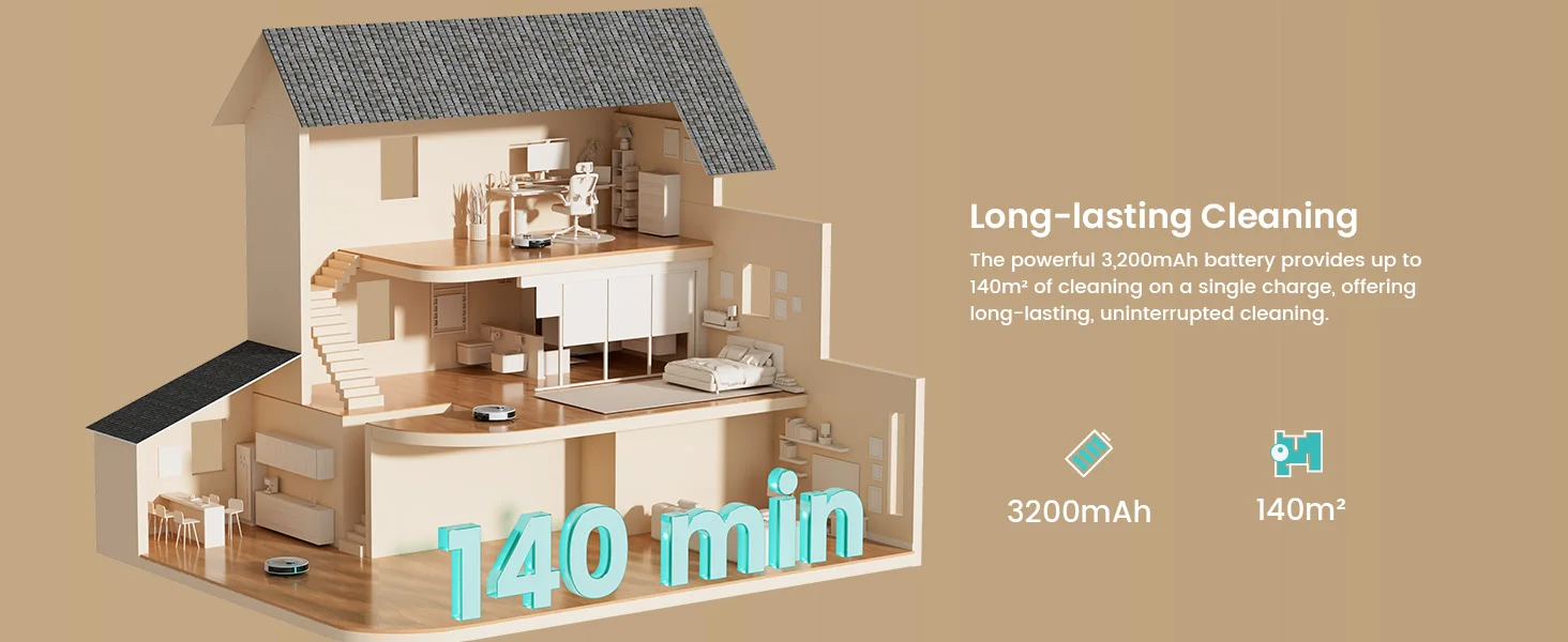 The powerful 3,200mAh battery provides up to140m of cleaning on a single charge, offeringlong-lasting, uninterrupted cleaning