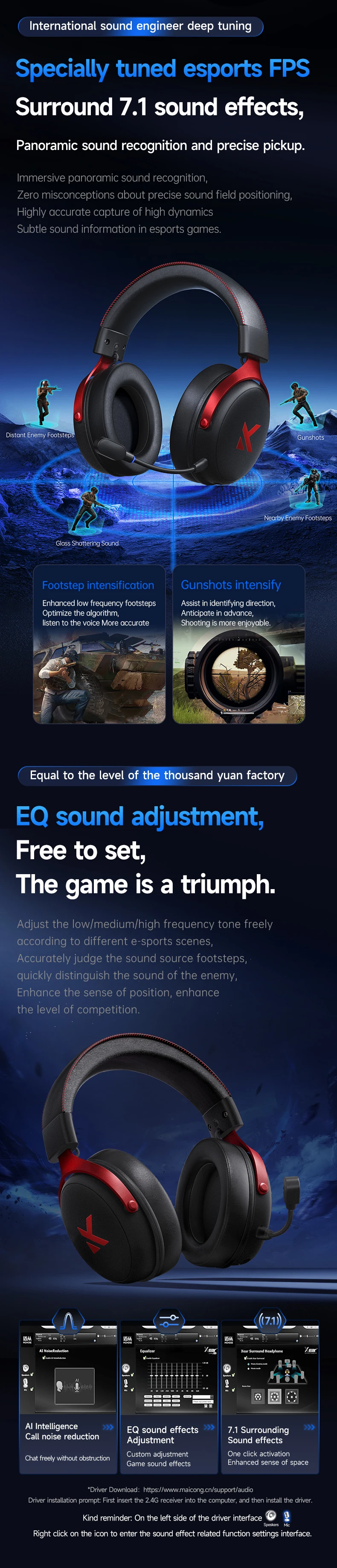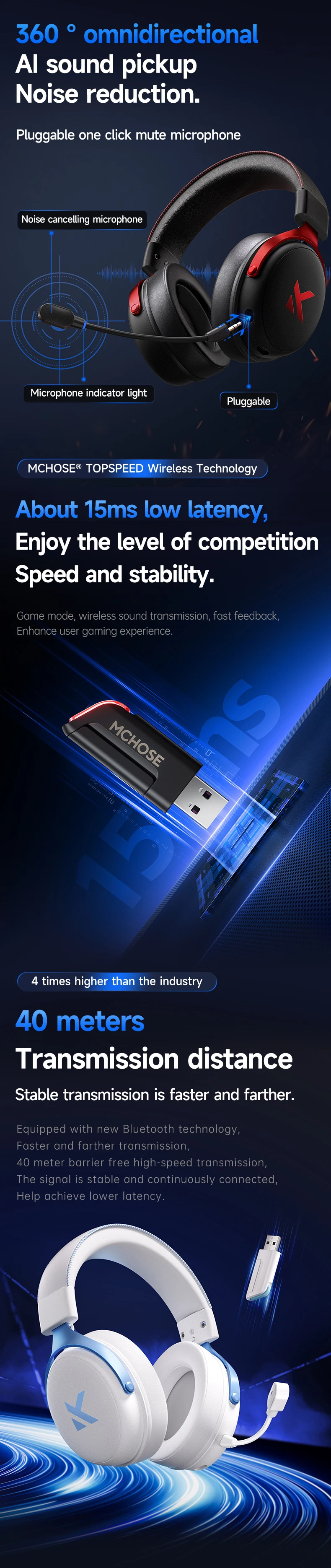 【MCHOSE TOPSPEED Connectivity】Our gaming headphones experience high-performance, 15ms low-latency gaming with an industry-leading 2.4GHz TOPSPEED wireless connection, delivering perfectly synchronized sound for a Esports game.