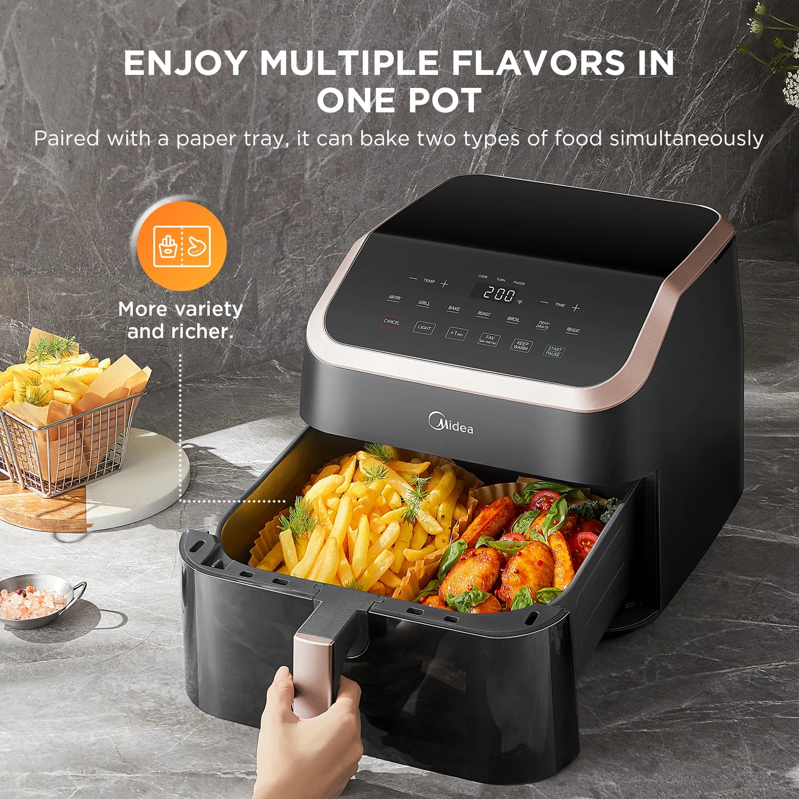 Midea XXL Air Fryer 9 L, 8-in-1, Extra Wide Chambers, Max 200 °C, Fryer without Oil, Grilling, Baking, Roasting, MAD85F9BPK