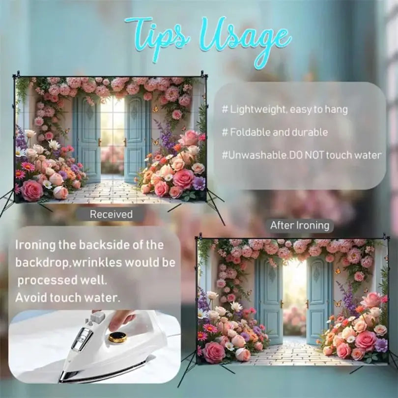 Answer 2:Put a cloth and use an iron to process backside(not the image side) of the backdrop at medium-low temperature. Repeatedly ironing it a few times until the wrinkles are removed.