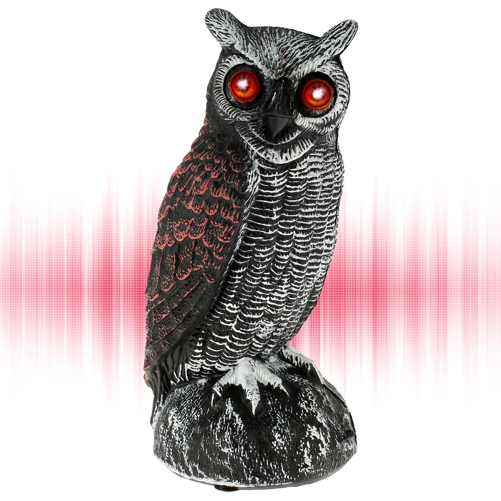 [Daytime and Nighttime Use] The garden owl scarecrow has 2 different working modes. The first mode is suitable for daytime use, when an animal passes by the motion sensor, the garden owl decoy will emit a scary sound and its eyes emit a red light. The second mode is recommended for nighttime use, when the owl's eyes will turn red and flash.