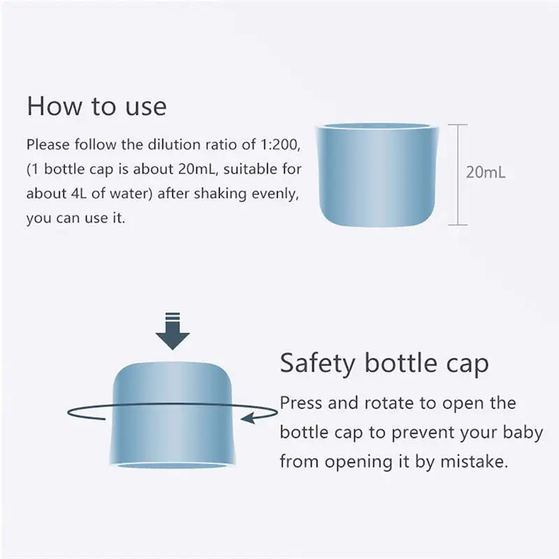 First step:Please follow the dilution ratio of 1:200, (1 bottle cap is about 20mL, suitable for about 4L of water) after shaking evenly, you can use it.
