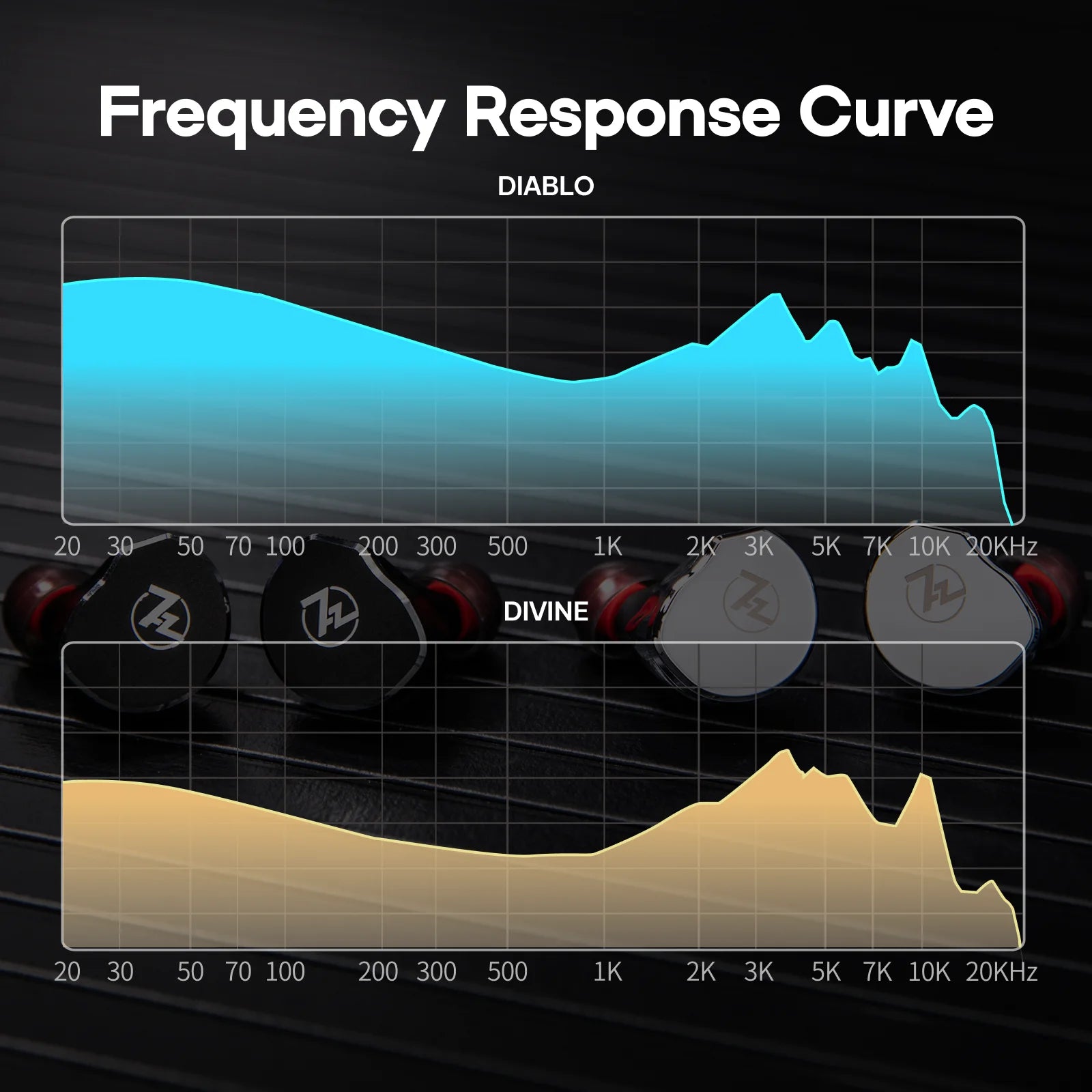 Both the Diablo and Divine feature a precise tuning strategy, featuring an exact 3kHz pinna curvature to match the perceived hearing of the human ear. Both models have a natural treble decay that provides ample micro-details and air, while maintaining a comfortable and smooth listening experience for all music genres. The Diablo boasts of a 12dB bass boost, which is perfect for hip-hop, EDM, and rock genres, with thick and rich mid-bass to bolster bass guitar and male vocals. The Divine has a more moderate 10dB bass shelf with a more subtle mid-bass transition, allowing the midrange to be more balanced and natural, without additional coloration.