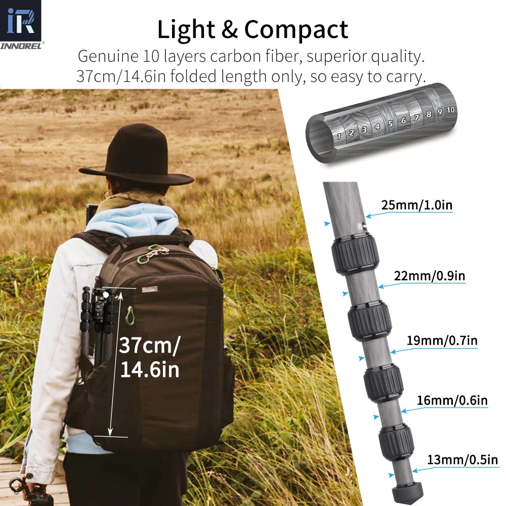 【Top Material】This carbon fiber tripod’ s max tube is 25mm ,it is made of 100% thick genuine 10 layers carbon fiber ,which makes the tripod much more stable and lighter.