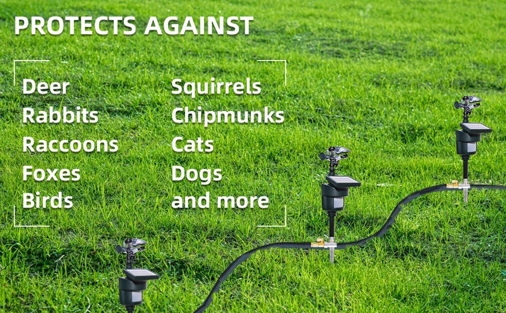 >Effective protection | Sprinkler animal repellent can effectively let birds, foxes, herons, cats, dogs, squirrels, deer, skunks, and other animals leave your garden