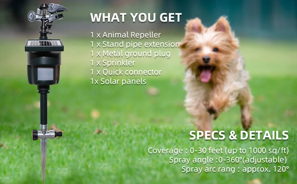 >Easy to set up | Motion sprinkler head can be adjusted 360 degrees, with a maximum detection range of 1000 square feet and a detection angle of 120 degrees. The sensitivity of the animal repellent can be adjusted according to your needs