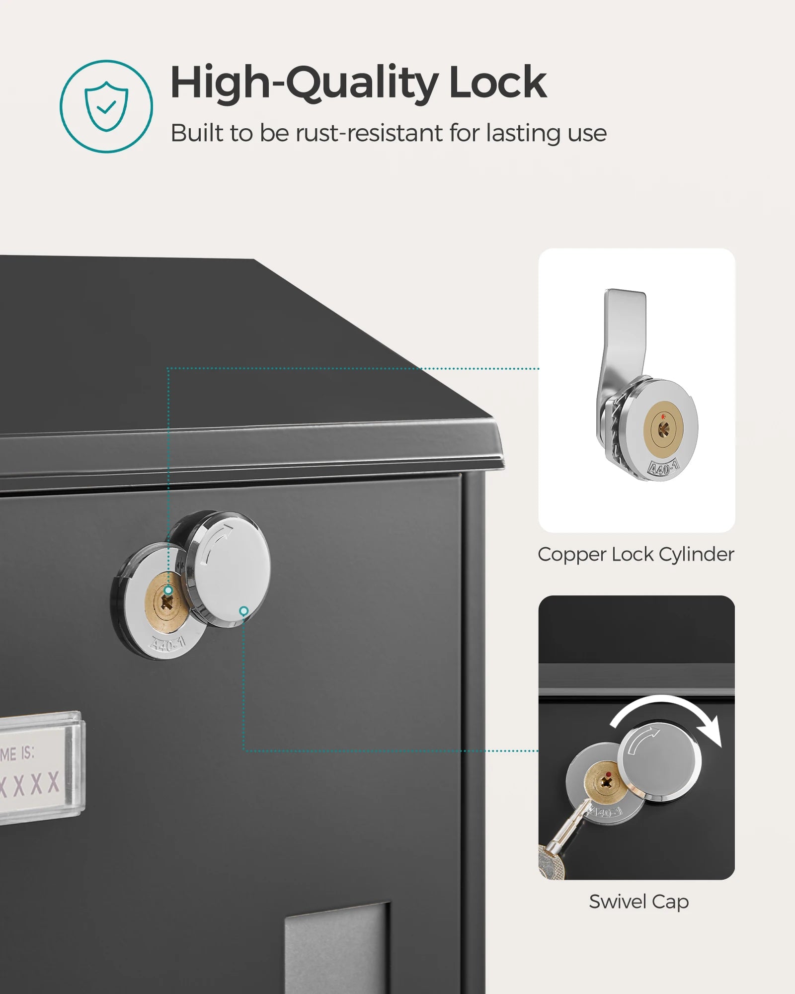 A Compact Shelter for Your Mail: Did the postman leave your post on the floor? Got your mail wet on rainy days? Tired of mail disappearing? The SONGMICS mailbox comes to the rescue by providing your mail a compact shelter. Made from zinc-plated steel and with a powder-coated matte finish, this mailbox protects your post from the elements for long-lasting service.