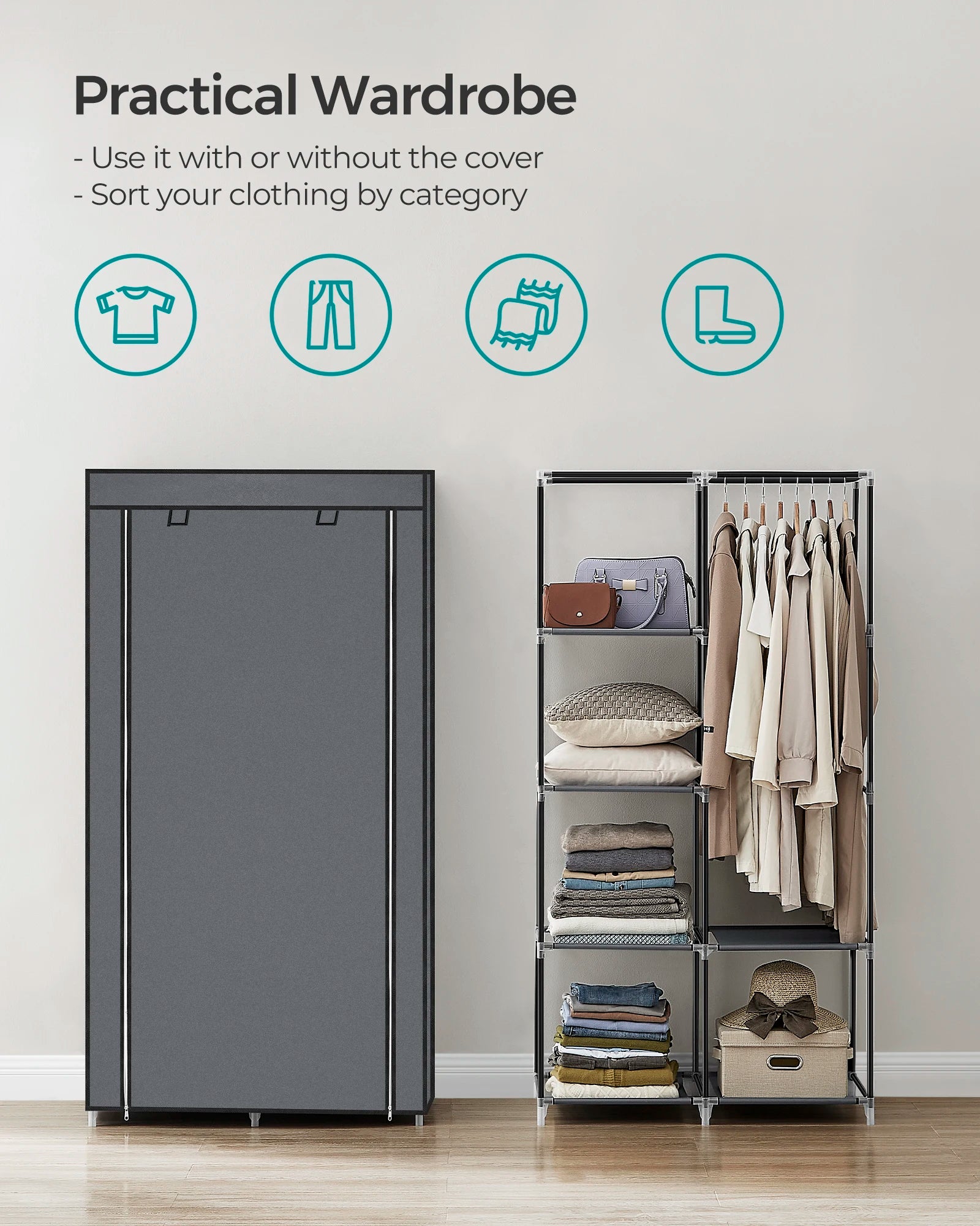Water-Resistant Fabric Cover: Protects your beautiful clothes from dust, water, or other accidents