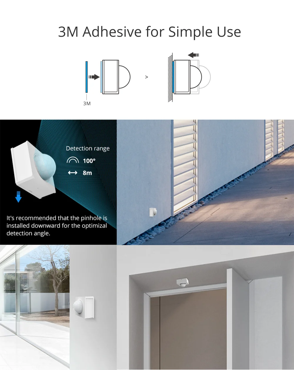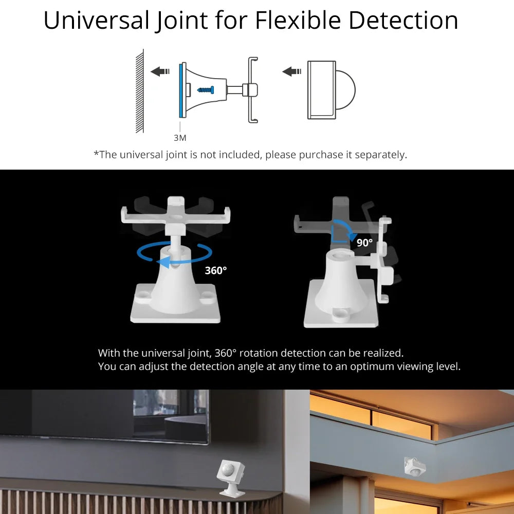 With the universal joint, the sensor can be flexible to rotate a full 360°horizontal angle and 90°vertical angle which allows you to adjust the sensor into an optimal angle to view everything in your home (The sensor doesn’t move on its own based on your motion). Another convenience for your home is that you can use the sensor for a position where the movement is not easy to be detected via mounting it in the universal joint, and just rotate the universal joint head to get a wonderful detecting angle. Plus, you can directly stick the sensor on the surface of objects to detect the movement. Just choose one as you like.