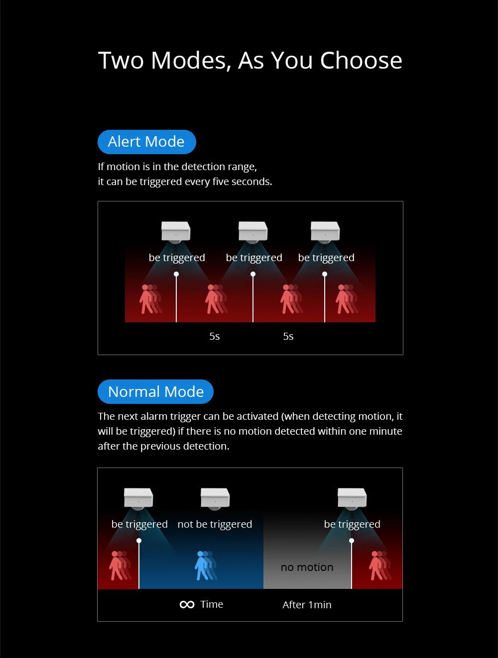 PIR3-RF has two built-in modes which are two different trigger time mechanisms to meet your needs in different scenarios.