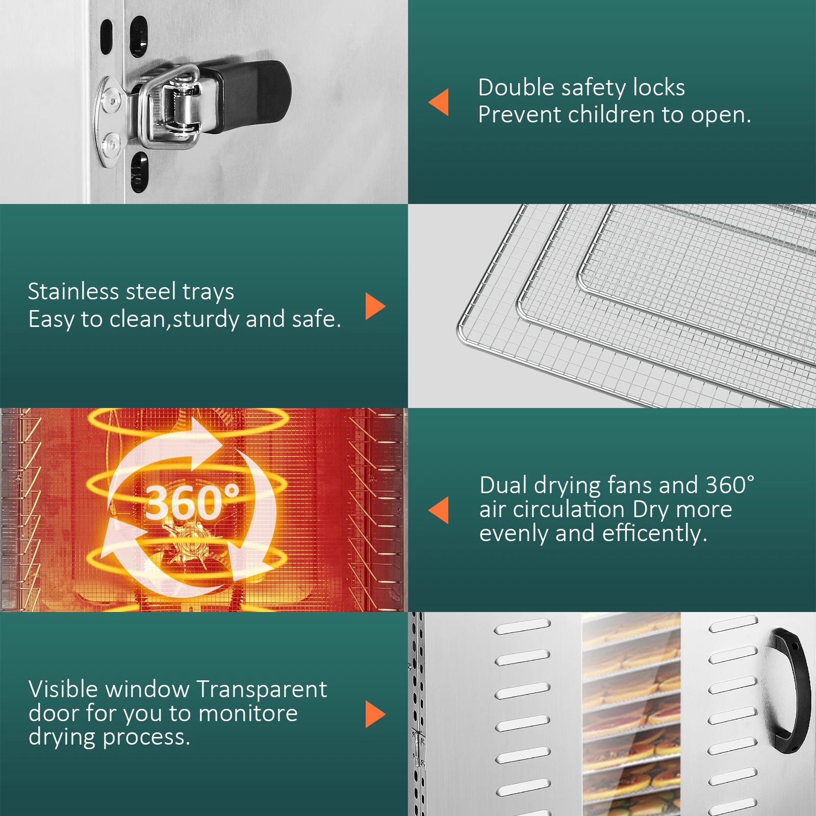 ��【EASY TO CLEAN & USE】- The stainless steel trays and the drip tray at the bottom of the commercial dehydrator are all removable, dishwasher-safe for your convenience. You can remove more trays at a time to make room for especially thick food If needed. The double handles are more convenient when moving the machine. Double safety locks can prevent children from opening, avoid safety problems.