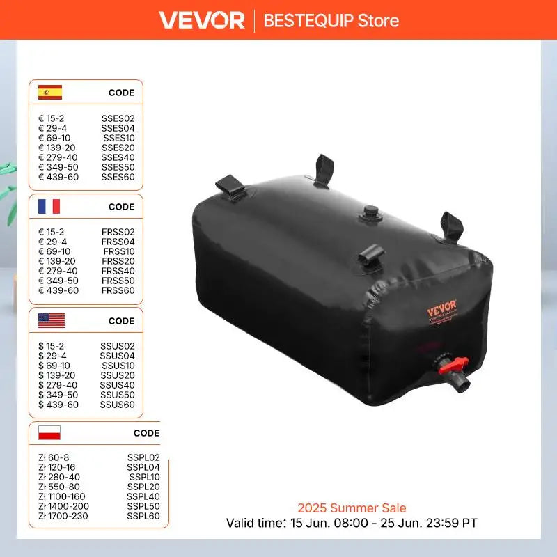 SucceBuy's 29.85-gallon collapsible water tank bladder is designed for efficient and secure water storage. Made from sturdy 1000D double-layer PVC, it offers excellent durability and a leak-proof design for reliable performance. Whether you need it for outdoor activities, home use, garden irrigation, or emergency water supply, this tank is versatile and easy to use, providing a dependable water storage option.