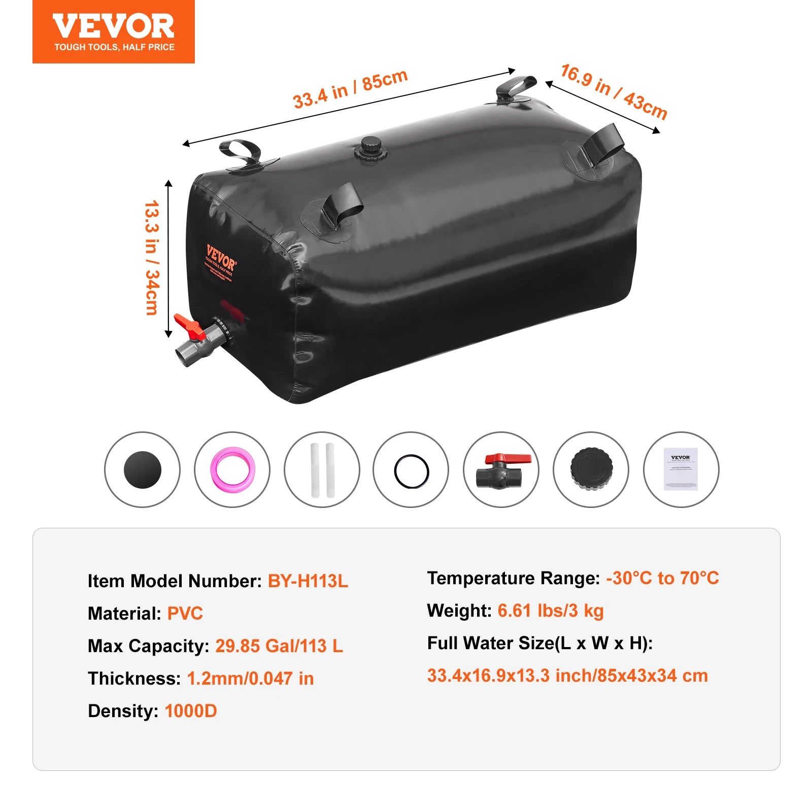 Max Capacity: 113 L (29.85 Gal) Full Water Size: 85 x 43 x 34 cm (33.4 x 16.9 x 13.3 inches) Weight: 3 kg (6.61 lbs) Material: PVC Thickness: 1.2 mm (0.047 inches) Density: 1000D Temperature Range: -30°C to +70°C Item Model Number: BY-H113L/li>