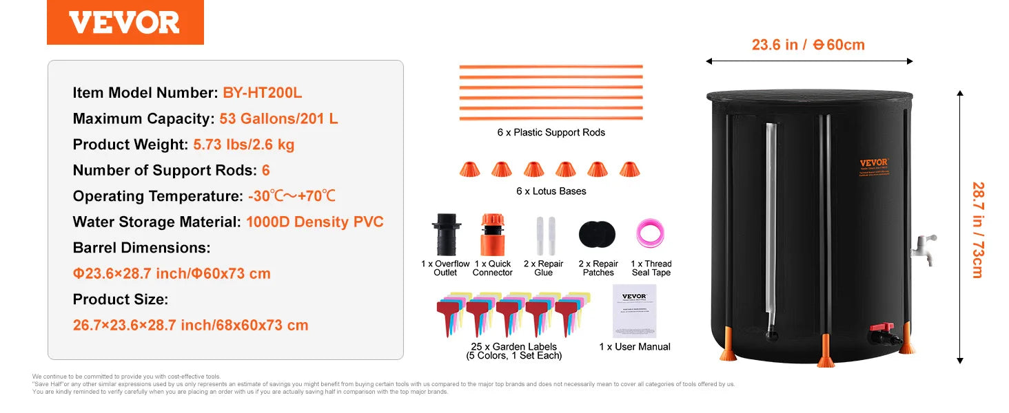 Convenient Design for Easy Use: The barrel’s transparent structure and measurement lines make monitoring water levels simple. A mesh top makes collecting rainwater easy, while dual outlets ensure fast and convenient water retrieval for all your outdoor or emergency needs.