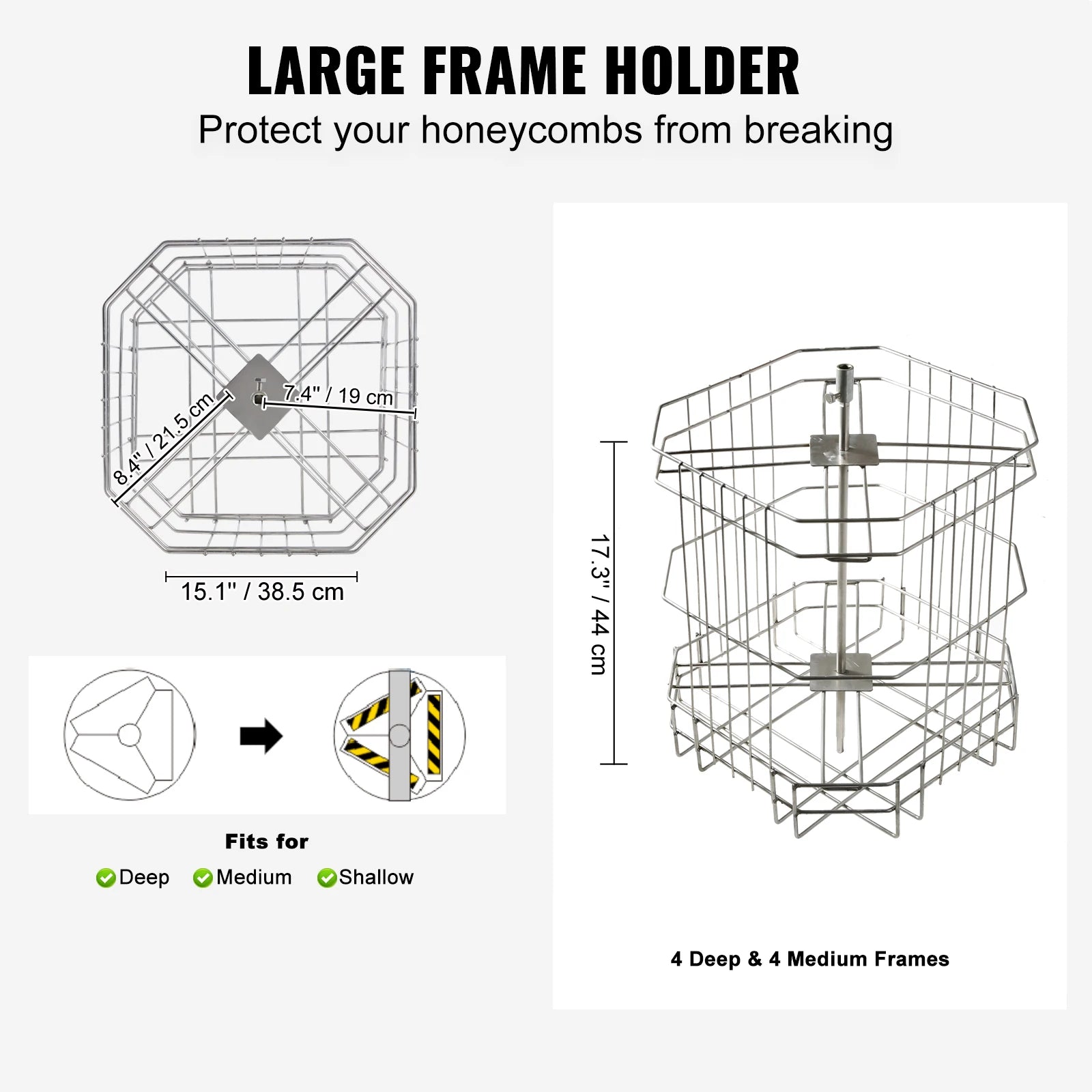 Adapted Honeycomb Size: Deep: 48 x 23 cm / 18.9" x 9", Medium: 48 x 16 cm / 18.9" x 6.3" Honey Gate: 45 mm / 1.8" Product Weight: 12.1 kg / 26.7 lbs Model: SD-4/8 Capacity: 4/8 Frames Operation: Manual Material: Stainless Steel/li>